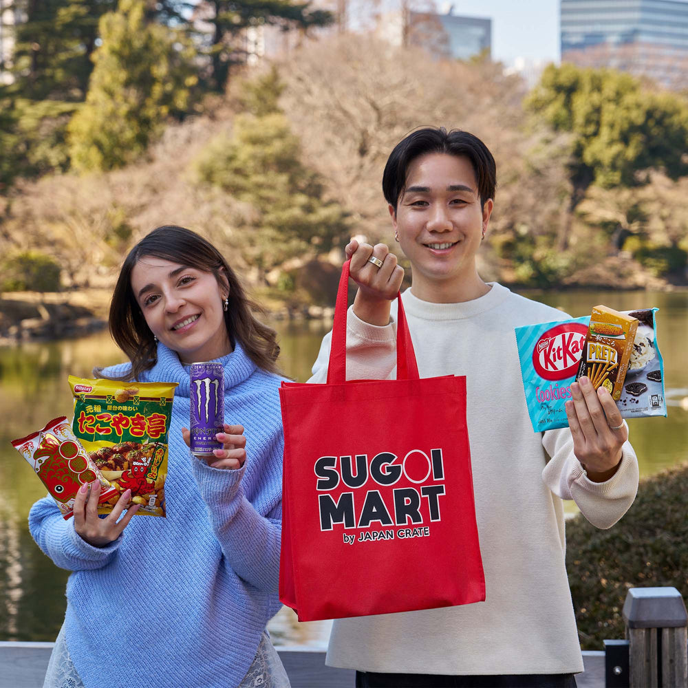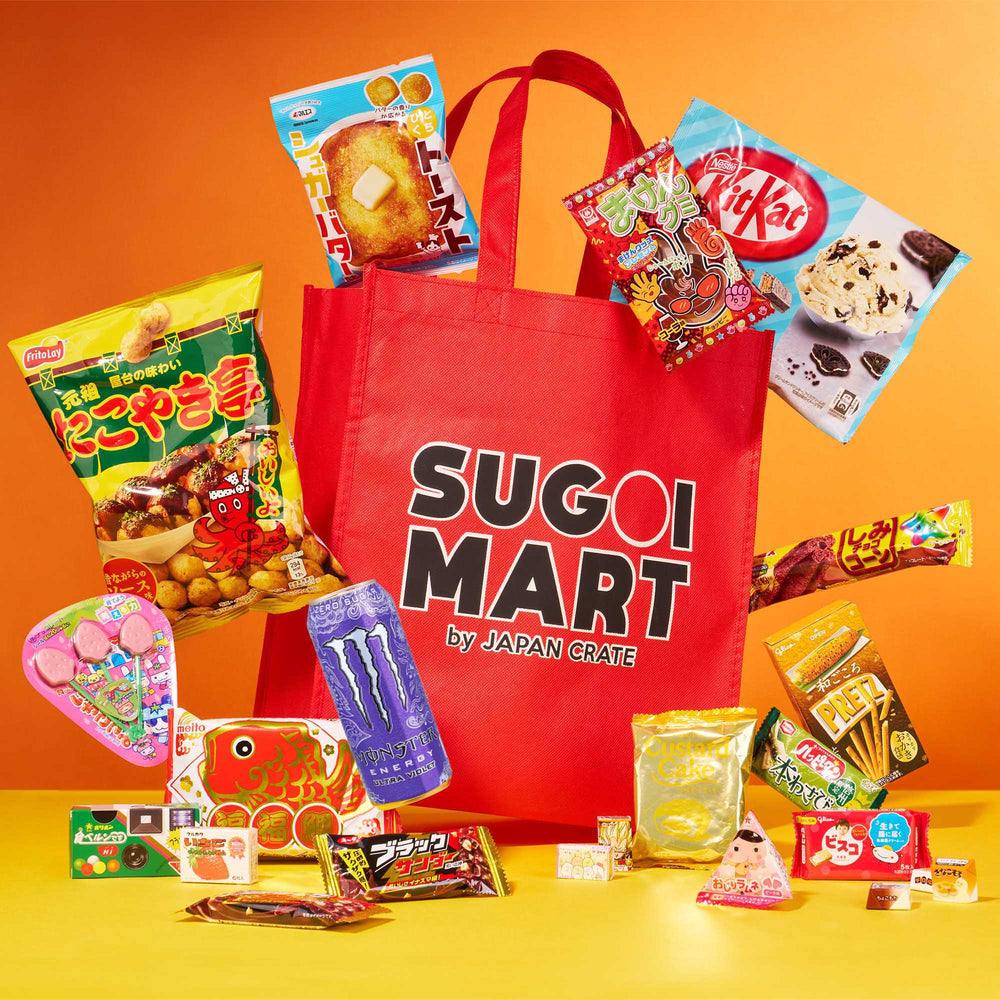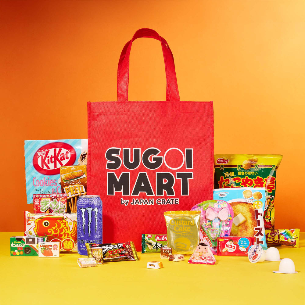 Unwrap the excitement with 18 to 20 surprise Japanese snacks and drinks, all packed in a Sugoi Mart reusable tote bag.