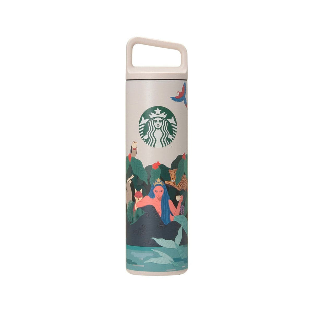 This Starbucks 2024 Handle Lid Stainless Steel bottle is functional and charitable simultaneously. Created in collaboration with Miir, each bottle sold offers a portion of profits to projects that benefit those without access to clean water or education. A tracking code ("Give Code") on the bottom of the bottle lets you see which project your purchase directly impacts. This stainless steel bottle also includes an exciting siren design that depicts her among nature. A convenient handle ensures this bottle is easy to transport anywhere.