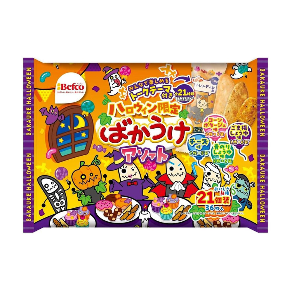Satisfy spooky (and savory) snack cravings with this Befco Kuriyama Rice Crackers 2025 pack! This pack includes 21 pouches split between four mouthwatering flavors. Discover the umami-rich seaweed and soy sauce, the nutty sesame fried soy sauce, the addictive cheese, and the rich corn potage flavors. These crispy crackers each come in a Halloween-inspired package, making them a fun option for trick-or-treaters, weekly lunches, or spooky season activities and parties.