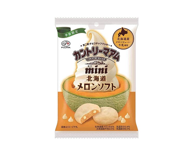 Fujiya brand summer 2022 limited edition Country Ma'am Hokkaido melon soft ice cream flavored mini cookies in a mini pack. Bite into soft dough cookies made with Hokkaido milk, melon puree, and mini bits of white chocolate cream.