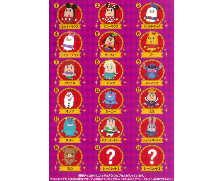 Furuta is back with this yummy chocolate egg in collaboration with Disney Japan. Inside is a miniature toy inspired by popular Disney characters. Collect 1 out of 18 possibilities pictured (16+2 Secret Characters).