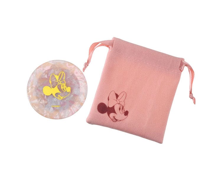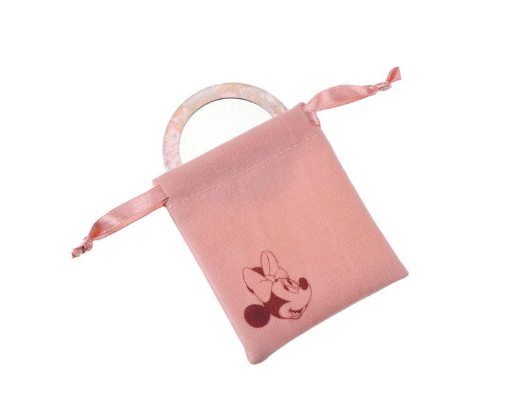 • Disney Japan exclusive pink tortoiseshell round mirror and drawstring pouch featuring a Minnie Mouse design.
