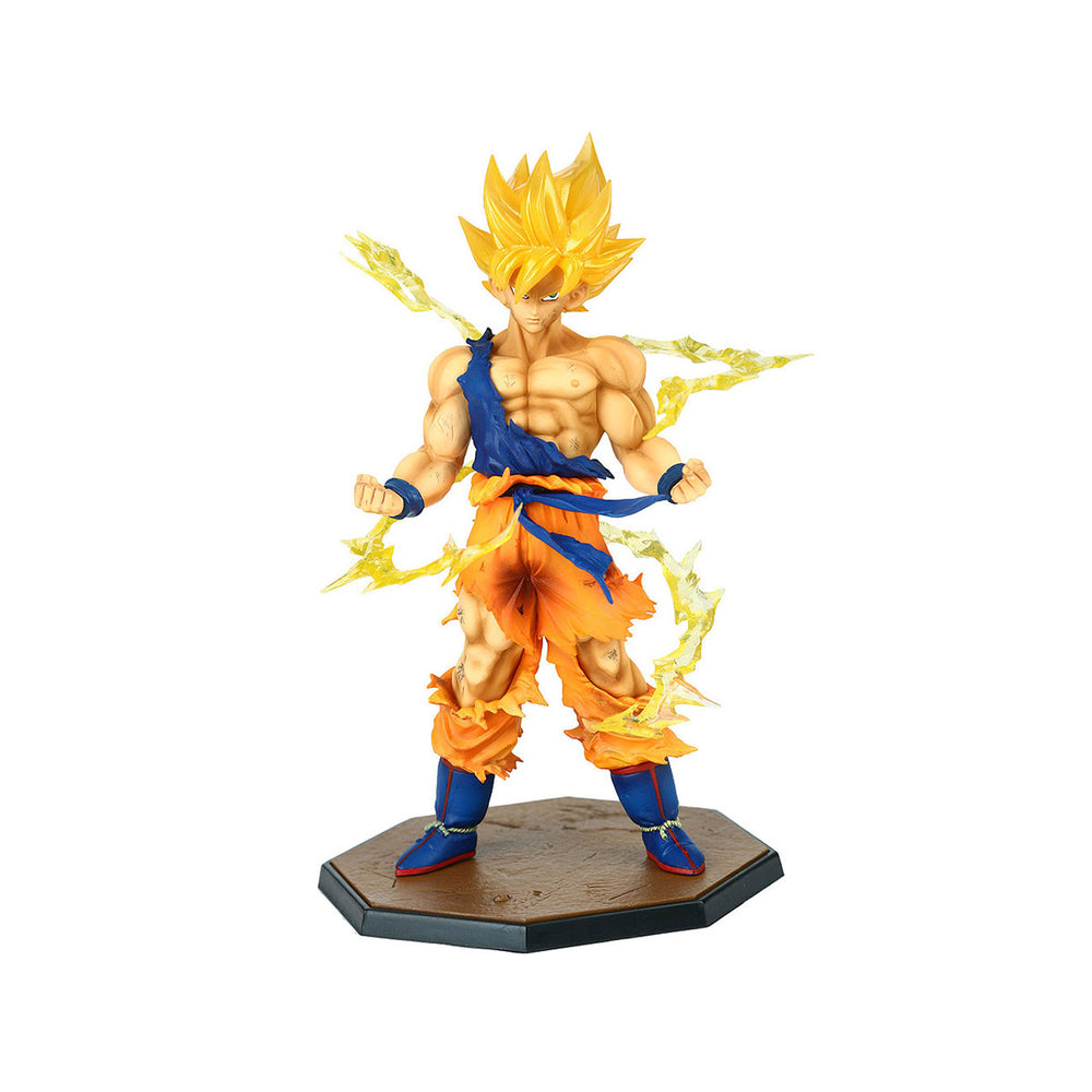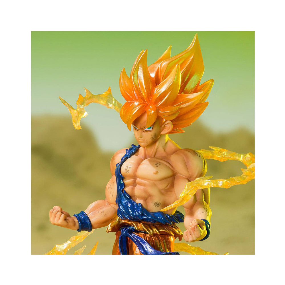 Experience the excitement of SS Son Goku using his super power-up with this collectible Dragon Ball Tamashii Nations Store Figuarts figure! Highlighting the power of his energy, this figure shows Super Saiyan Son Goku with aura flares behind him. This collectible comes with a stand, perfect for displaying this dynamic figure!