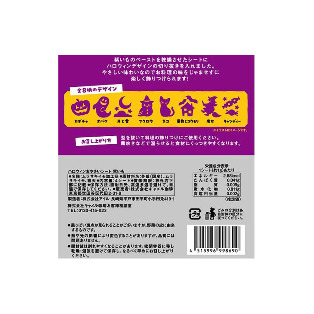 Enhance spooky season meals with this Halloween Purple Sweet Potato Vegetable Sheet pack! It features eight Halloween-inspired designs, from a jack-o-lantern to a ghost. Simply cut out the design, moisten the sheet, and apply it to your food of choice for a fun, decorative effect. These sheets feature a mild sweet potato flavor, so you can add them to any savory dish, including wraps, sandwiches, chicken tenders, or rice for a Halloween flair!