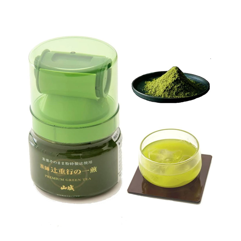 Crafting the perfect cup of matcha is made easy with this Issen Gyokuro Premium Green Tea by Tsuji Shigeyuki! It features a unique lid that measures out the perfect amount of green tea powder every time. Flip the container upside down over a cup, turn the knob 180 degrees, and it dispenses a pre-determined amount of powder. Use this green tea powder for hot or cold beverages, such as matcha lattes.