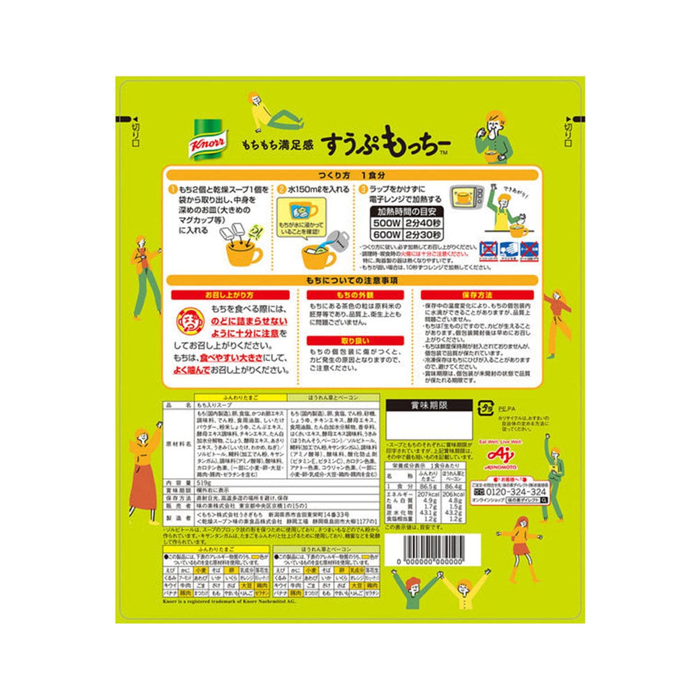 Crafted for busy families and professionals, this Knorr Soup with Mochi pack provides a delicious and convenient meal. Made with fluffy eggs, chewy mochi, and a delightfully savory broth, this soup is an easy go-to on busy weeks. Add this freeze-dried soup to a bowl with water and microwave, and it's ready to enjoy!