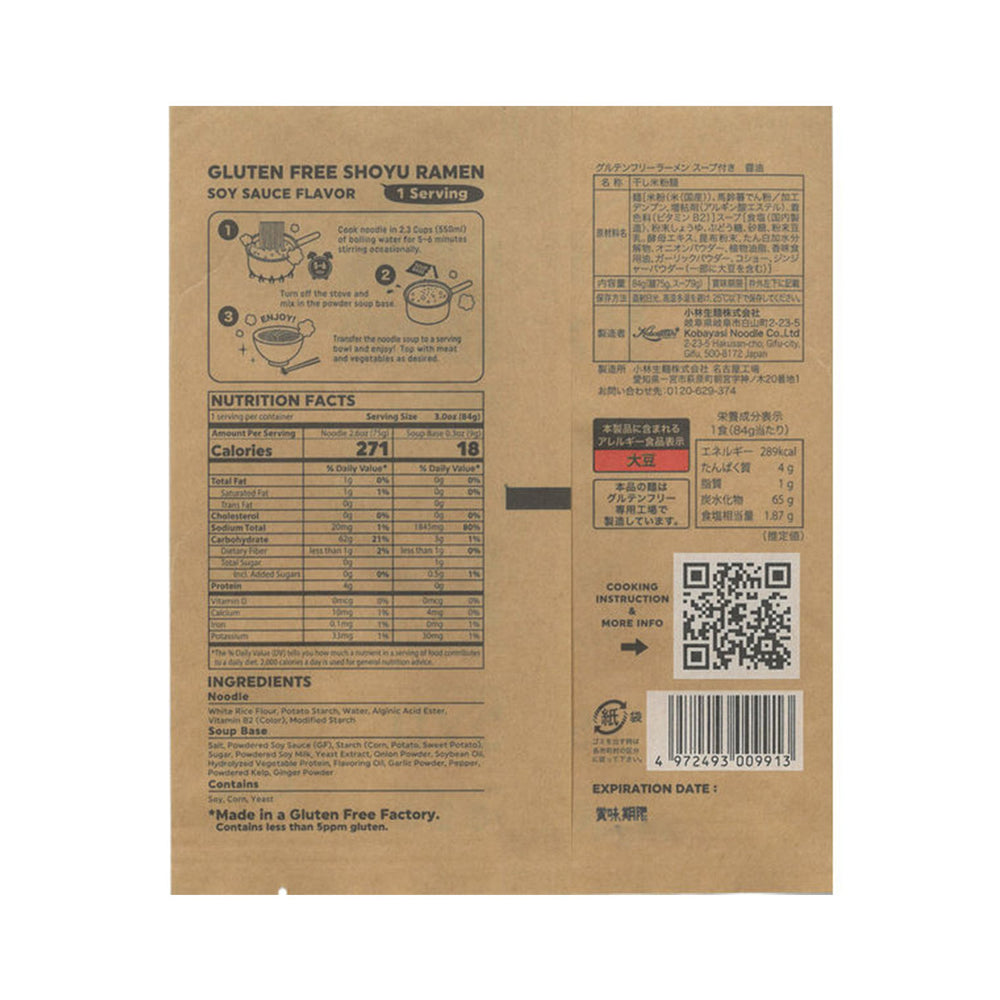 Satisfy ramen cravings with a convenient pack of Kobayashi Snack Ramen Soy Sauce Flavour! This ramen is crafted with Japanese rice flour, a naturally gluten-free ingredient. Unlike other instant noodle packs, these noodles are dried, not deep-fried, making them a healthier option. This pack also includes a deliciously savory umami-rich broth for a boost of flavor. Add your favorite toppings once cooked, like soft-boiled eggs and green onions, and enjoy!
