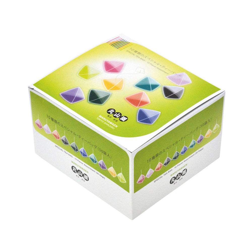 This Maruyamaen Specialty Tea Bags assortment is the ultimate hosting item! It features 10 types of teas, each sourced from well-known tea-producing areas. This box includes the following types of tea: Earl Grey, Uji tea, Houjicha, Genmaicha with matcha, Rooibos tea, Gyokuro, Black oolong tea, Jasmine tea, Yame tea, and Darjeeling. Each type of tea comes with five bags, ensuring there's plenty for any guests who stop by your house. This assortment also makes an excellent gift for tea lovers.
