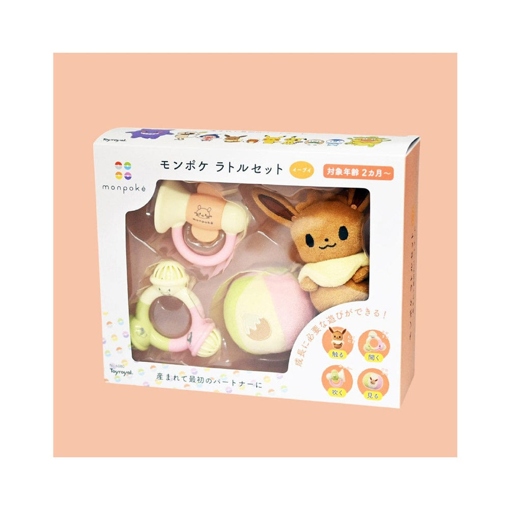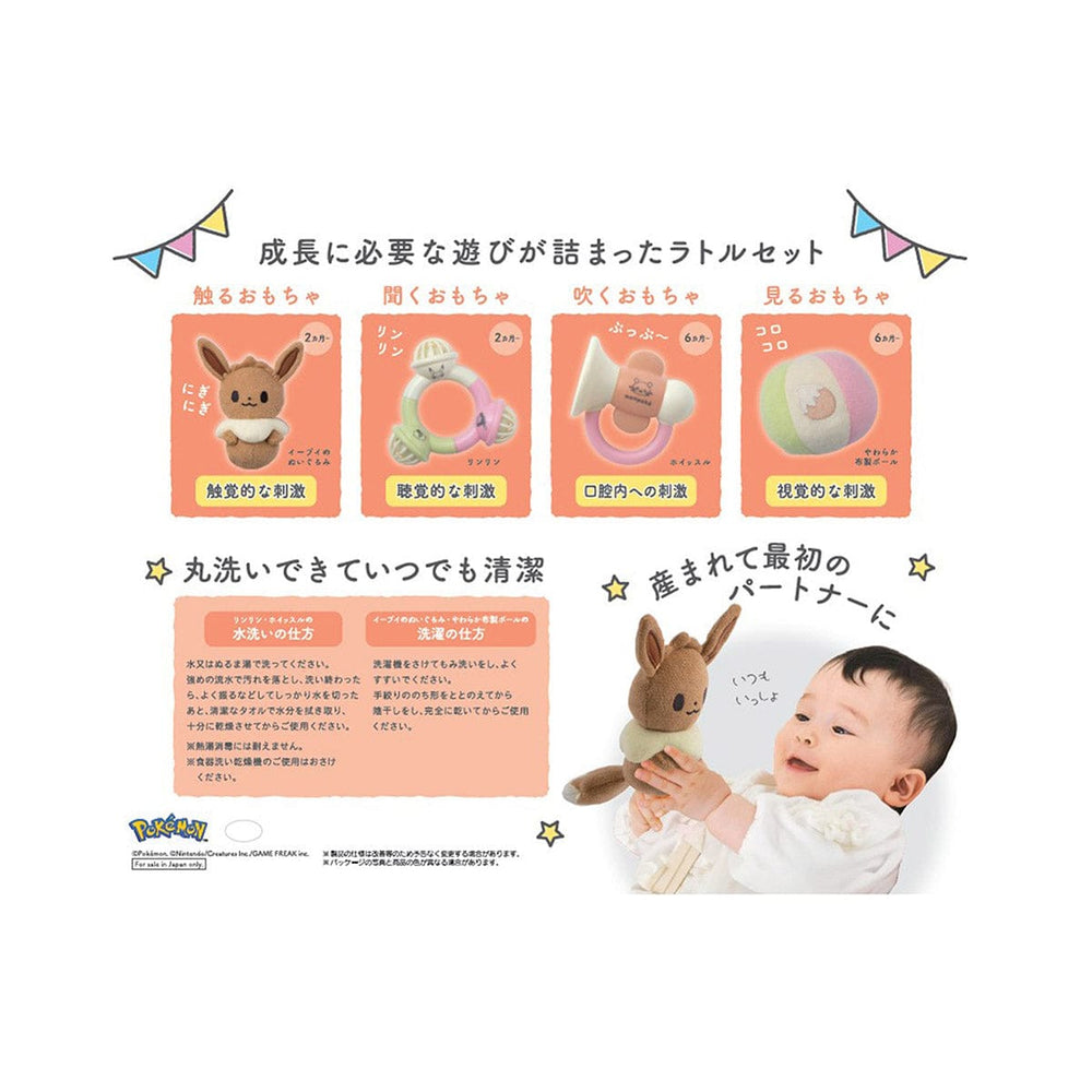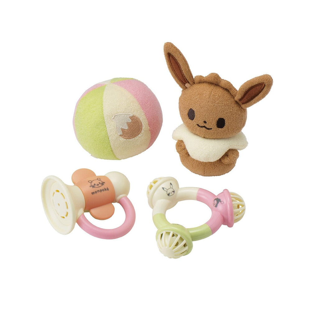 Encourage baby's development with this super-cute Eevee Pokemon Monpoke Rattle Set! Each of the four items is crafted to develop skills such as touch, hearing, and sight. The rattle and Eevee plush toy are ideal for 2-month-olds, encouraging skills like touch and hearing. The trumpet and cloth ball are great for 6-month-olds, as they encourage vocalization and coordination. This set grows with babies, making it the perfect gift for new parents.