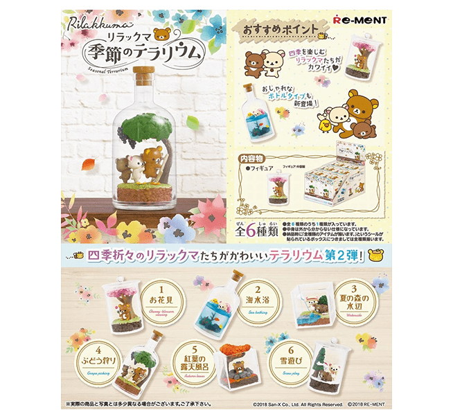 Blind Boxes are just like gachapon, in which it's a surprise as to what you'll get! Here we have a terrariums featuring Rilakkuma and his friends enjoying the four seasons. Get 1 out of 6.