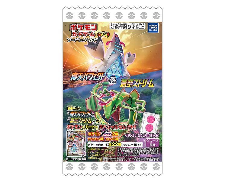 These Pokemon candy packs are extremelly famous in Japan as they come with 2 grape flavored gummies and 1 random pokemon card from the Skyscraping Perfect & Blue Sky Stream series. Gotta catch them all!
