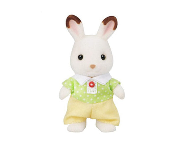 The Chocolate Rabbit Boy figure features white fur with chocolate-colored ear tips. He is dressed in a green polka-dot shirt with a white collar and yellow pants, adding to his adorable and playful look, the soft and flocked texture, give it a realistic and pleasant feel. The clothing is made from fabric and is removable, allowing for outfit changes.