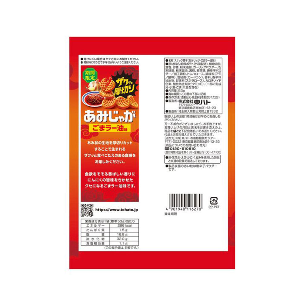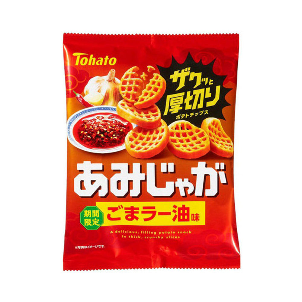 Spicy and packed with flavor, these Tohato Amikata Tamara Oil Flavor chips are a must-try! They're crafted with thick-cut potatoes and dusted with a fiery chili garlic oil seasoning. Enjoy their extra crunchy texture whenever a savory craving hits!